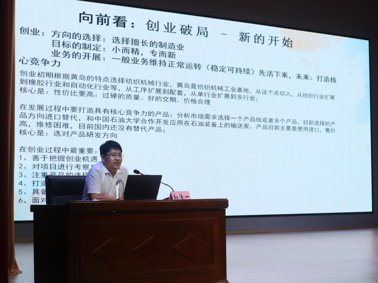 报告会前,党总支副书记李银宾为和法一颁发了“创新创业导师”聘书,此举是学院优化育人体系、提升人才培养质量的重要举措。报告会上,和法一为学弟学妹分享了三段路程:第一段:回头看:母校给我的“三颗心”:初心、匠心、仁心,他感恩母校半军事化管理塑造的纪律意识与“理论+实践”教学筑牢的专业根基;第二段:向前看:职场与创业的“破局思维”,他复盘从企业一线职工成长为首席技师、再到自主创业深耕纺织机械与石油装备领域的历程;第三段:向内看:人生路上的“警示牌”与“指南针”,他叮嘱同学们坚守底线、明晰初心。