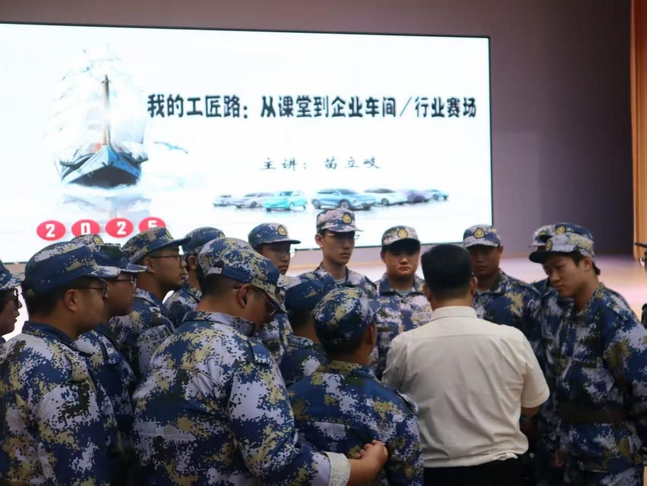 苗立岐结合自身“操作工—技能大师”的成长经历,拆解“学习—竞赛—创新”的职业进阶路径,并聚焦智能制造转型趋势,强调技能人才需以终身学习破局技术迭代,提升核心竞争力。他以“守初心、迎变化、践变革、创价值”为纲,激励学子将个人成长融入国家产业发展,走技能成才、报国之路。互动环节中,其专业解答进一步点燃学子学习热情。